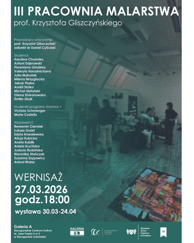 27 marca 2026 roku (piątek) w Galerii A im. Michała Faryseja odbędzie się wernisaż wystawy III PRACOWNI MALARSTWA prof. Krzysztofa Gliszczyńskiego z Akademii Sztuk Pięknych w Gdańsku.